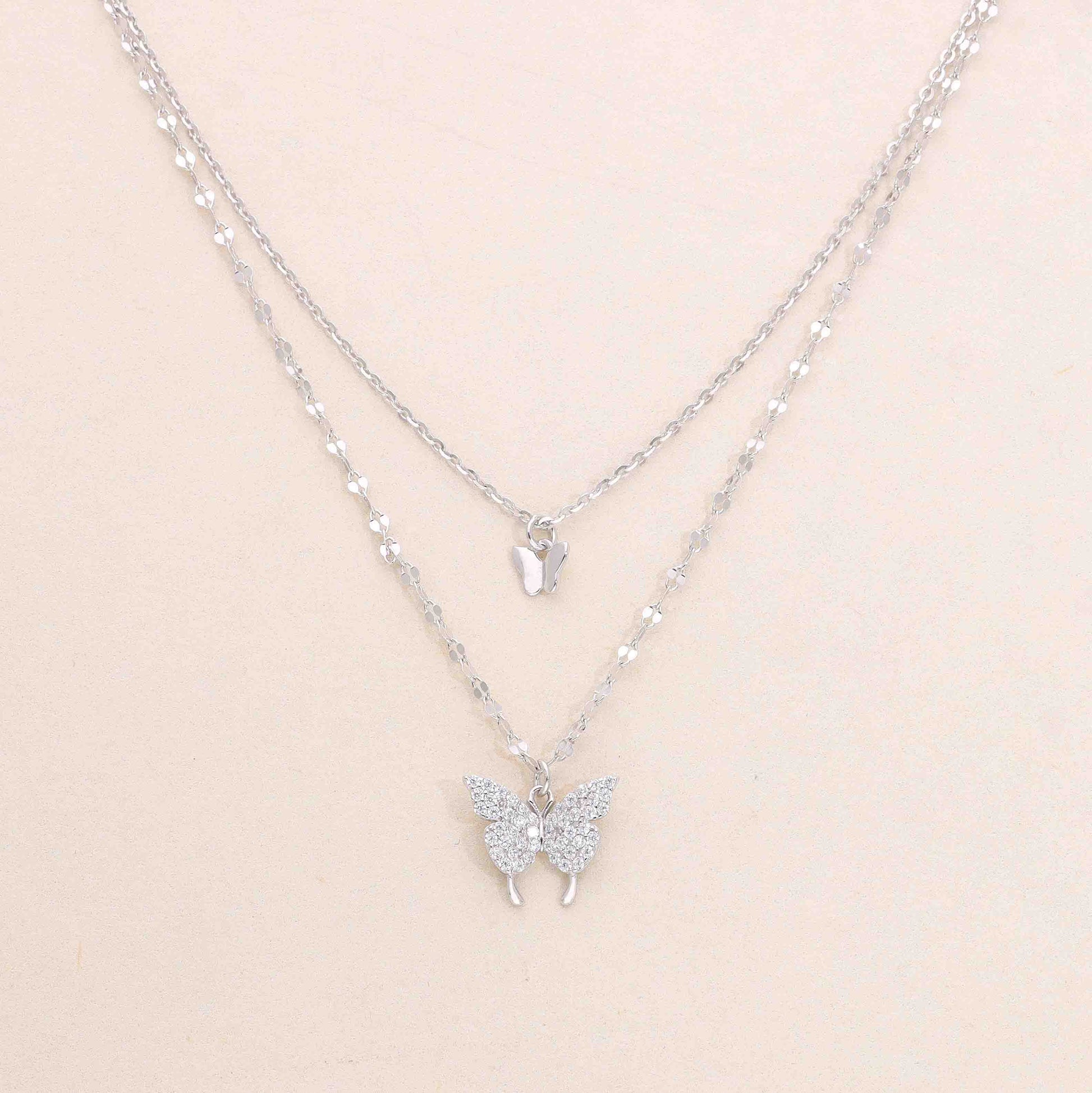 Light and graceful, this layered butterfly necklace captures the beauty of delicate movement with two finely detailed pendants. Crafted from 925 sterling silver, it is designed with subtle shimmer and clean lines for a refined, airy feel. Elegant yet minimal, it adds a soft statement to everyday styling while maintaining a timeless, feminine aesthetic.