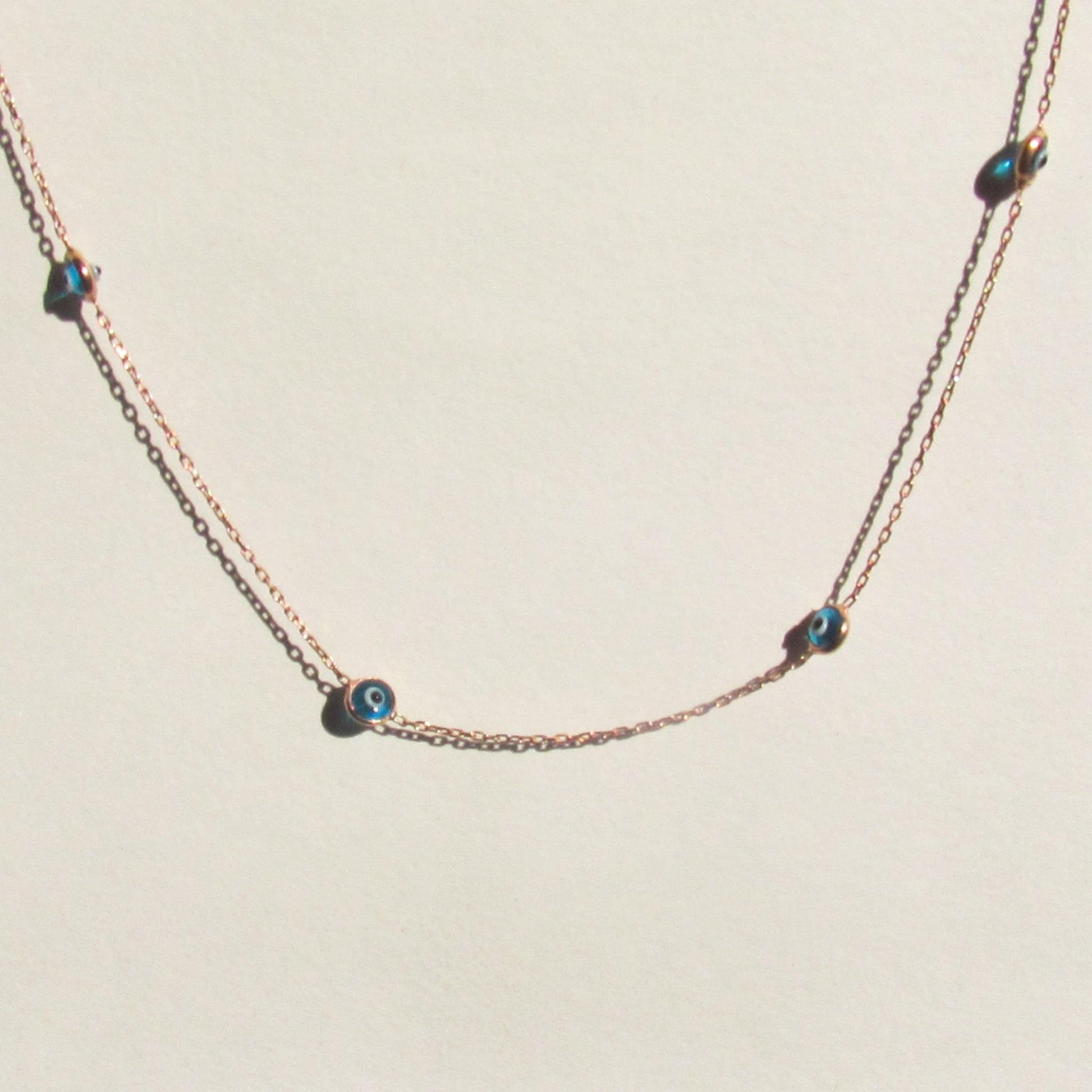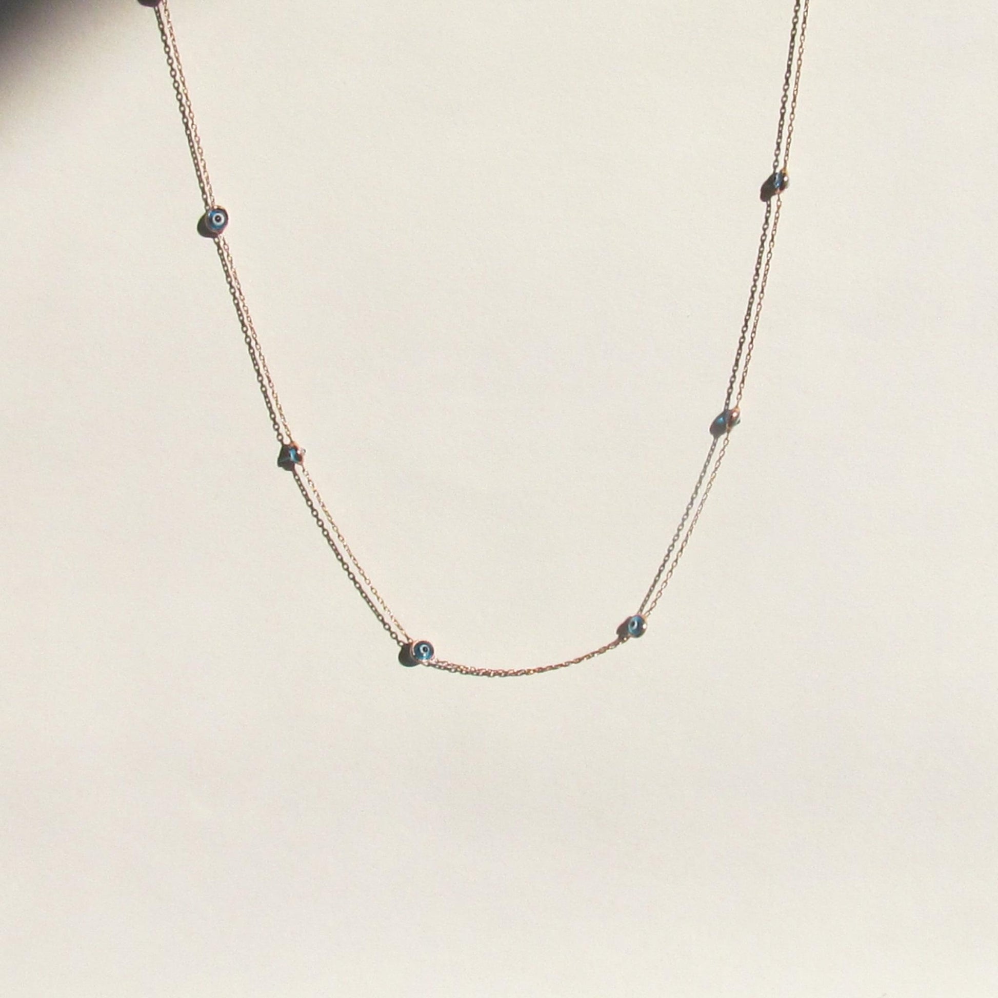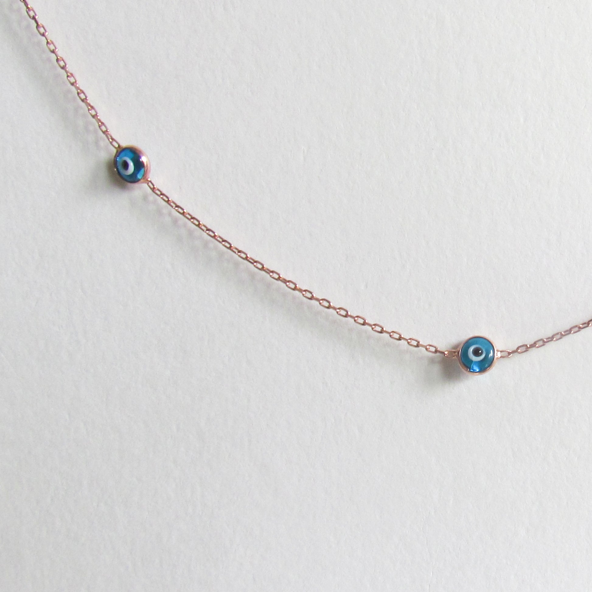 A Rose Gold 925 Sterling Silver piece with pretty little light blue evil eyes, this Ana Evil Eye necklace looks and feels fantastic. It elevates your outfit and adds a feminine vibe to your style. Pair this necklace with your favourite pair of dangle earrings and your V-neck top to get an elegant and feminine look.
