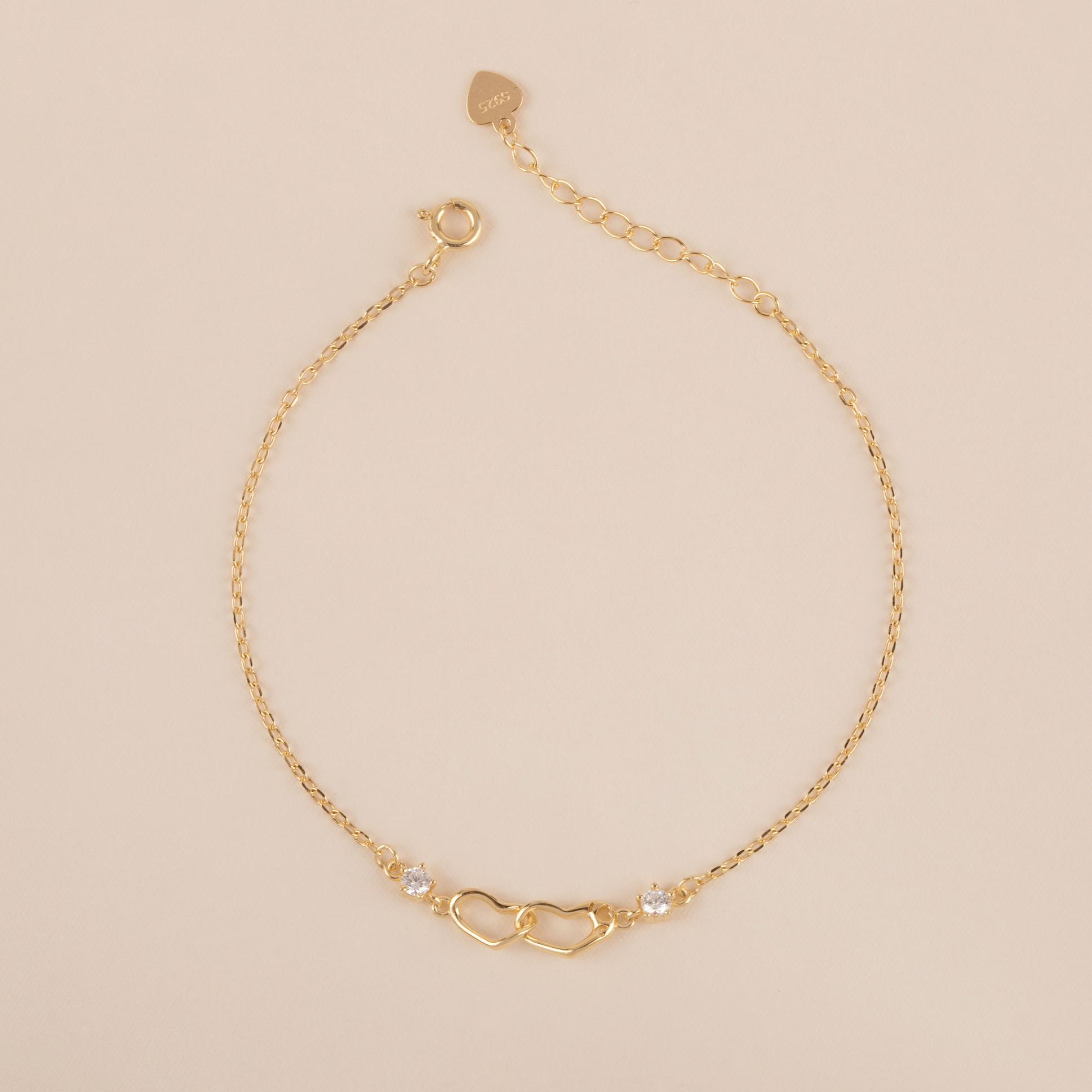 The Cleo Heart Bracelet is a delicate symbol of love and connection. Crafted in a radiant gold finish, it features two interlinked open hearts at the centre, accented by shimmering cubic zirconia stones on either side. Set on a fine, adjustable chain, this bracelet is perfect for everyday wear or as a meaningful gift for someone special. Simple, elegant, and timeless - these 3 words sum up what this bracelet brings to the table!
