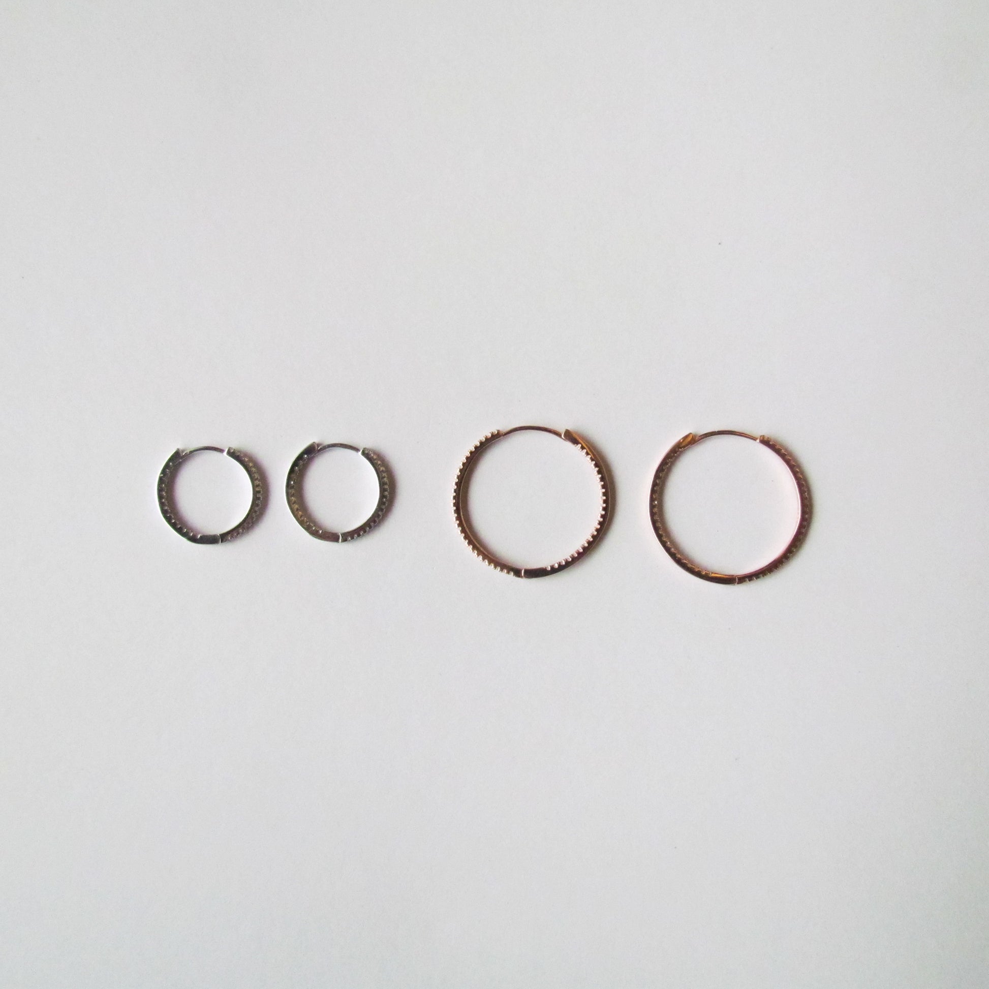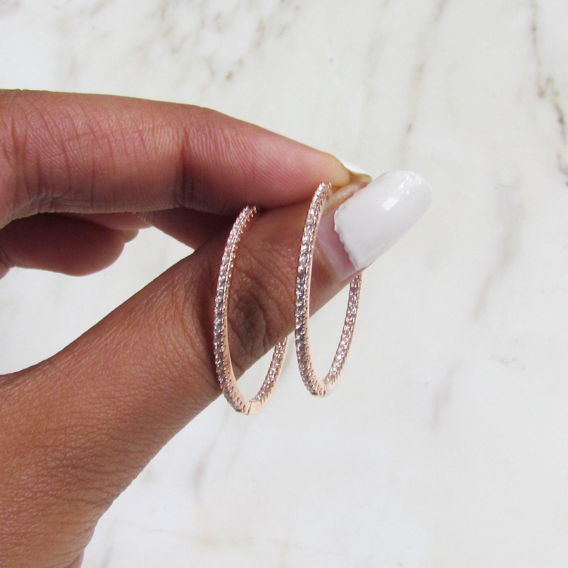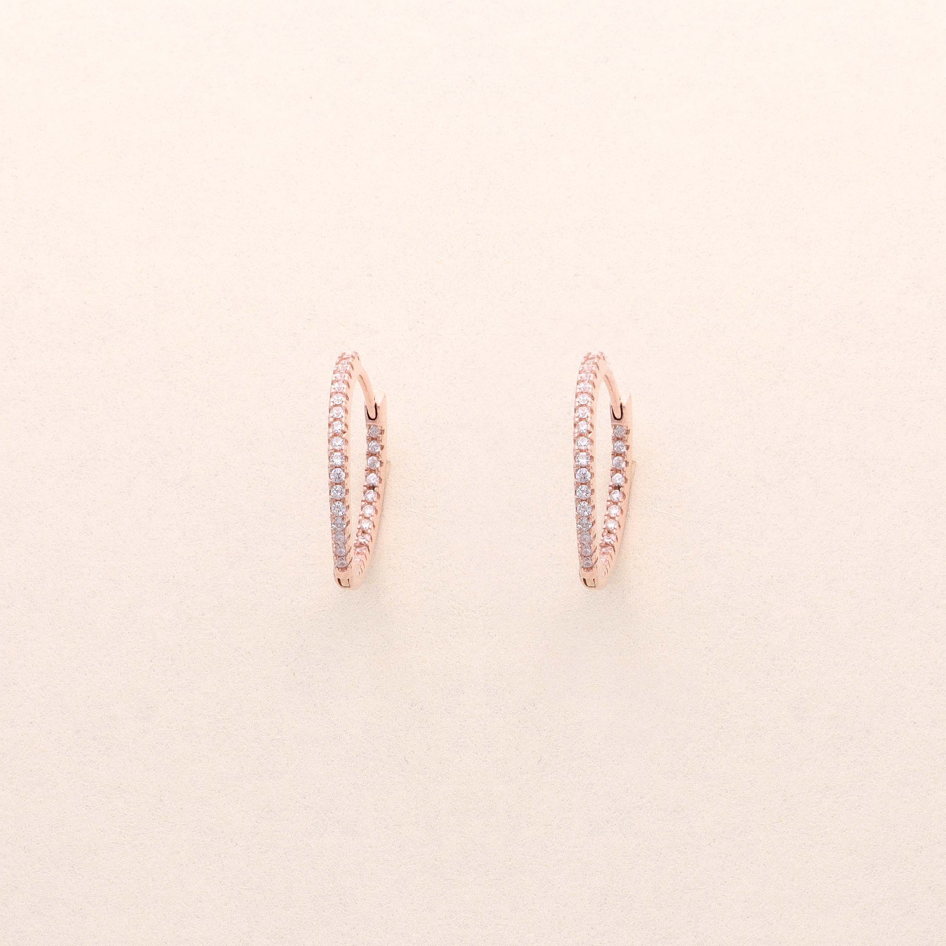 Discover our elegant Elise Hoop Earrings, crafted in 925 Sterling Silver and available in silver and rose gold finish. Designed to be lightweight and comfortable with an easy snap/click closure for secure wear. Adorned with cubic zirconia gemstones that brilliantly sparkle from both the front and back, these earrings ensure your style shines from every angle. Whether for day or evening, these timeless hoops add a touch of sophistication to any outfit.