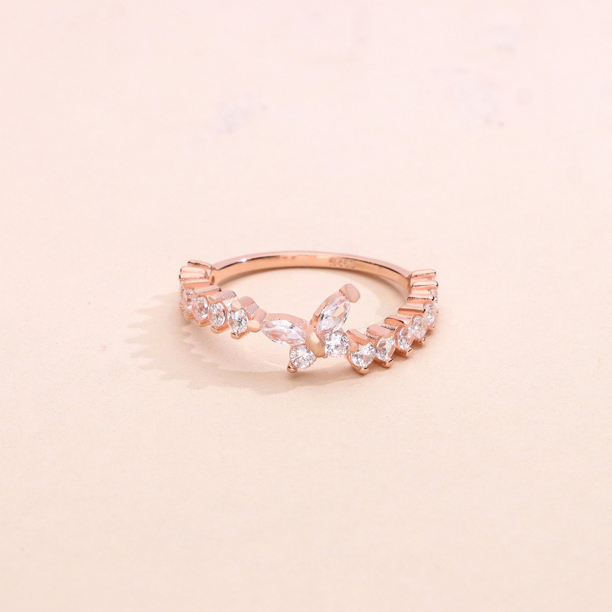 A stunning arrangement of alternating marquise and round-cut crystals scattered across the front of a delicate rose gold band, creating a wild, organic cluster effect that mimics the look of scattered petals or fallen stars. No two stones sit the same way, giving it a beautifully undone, free-spirited quality. Crafted in 925 sterling silver with a warm rose gold finish — effortlessly bridal, endlessly wearable.