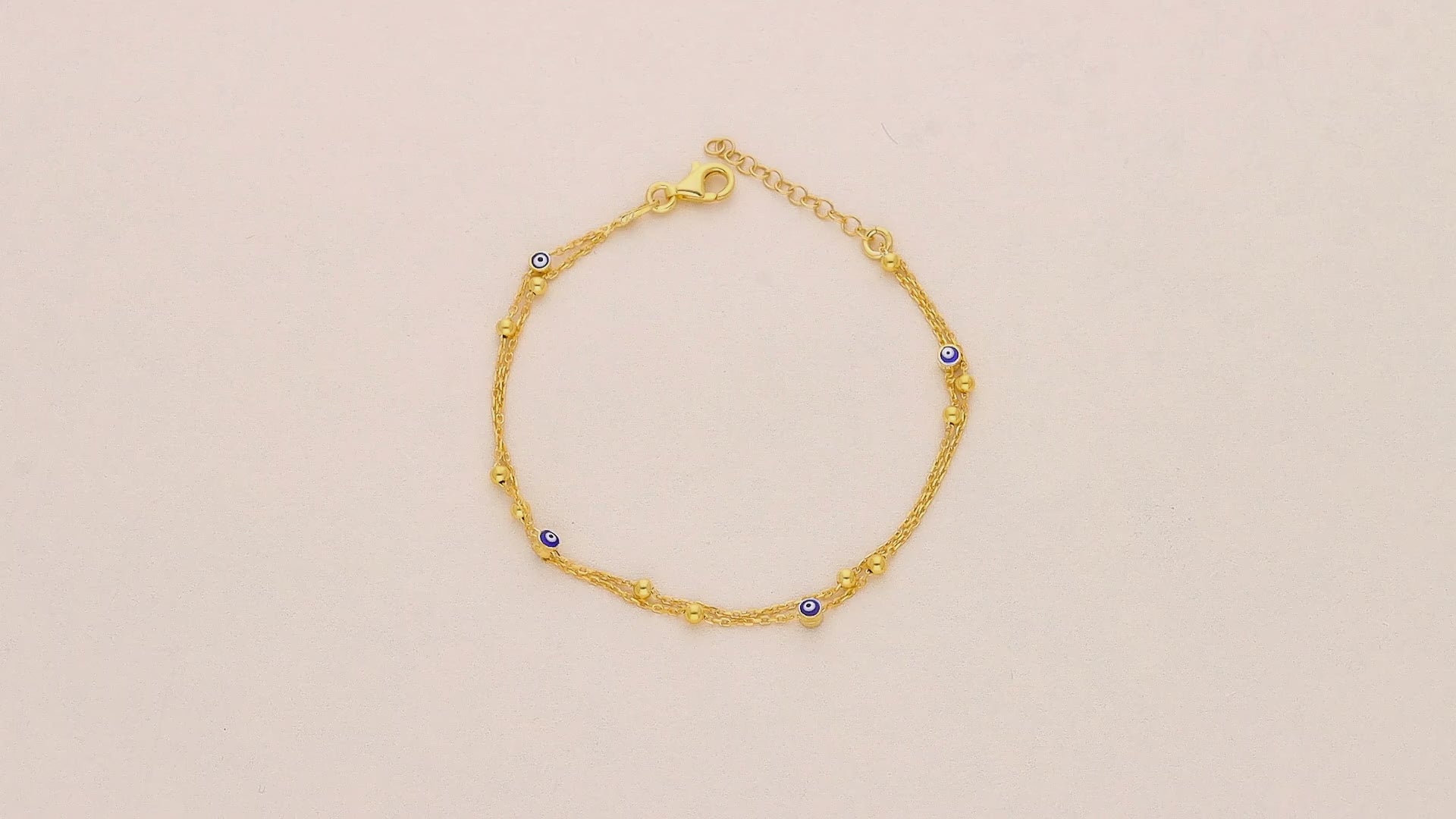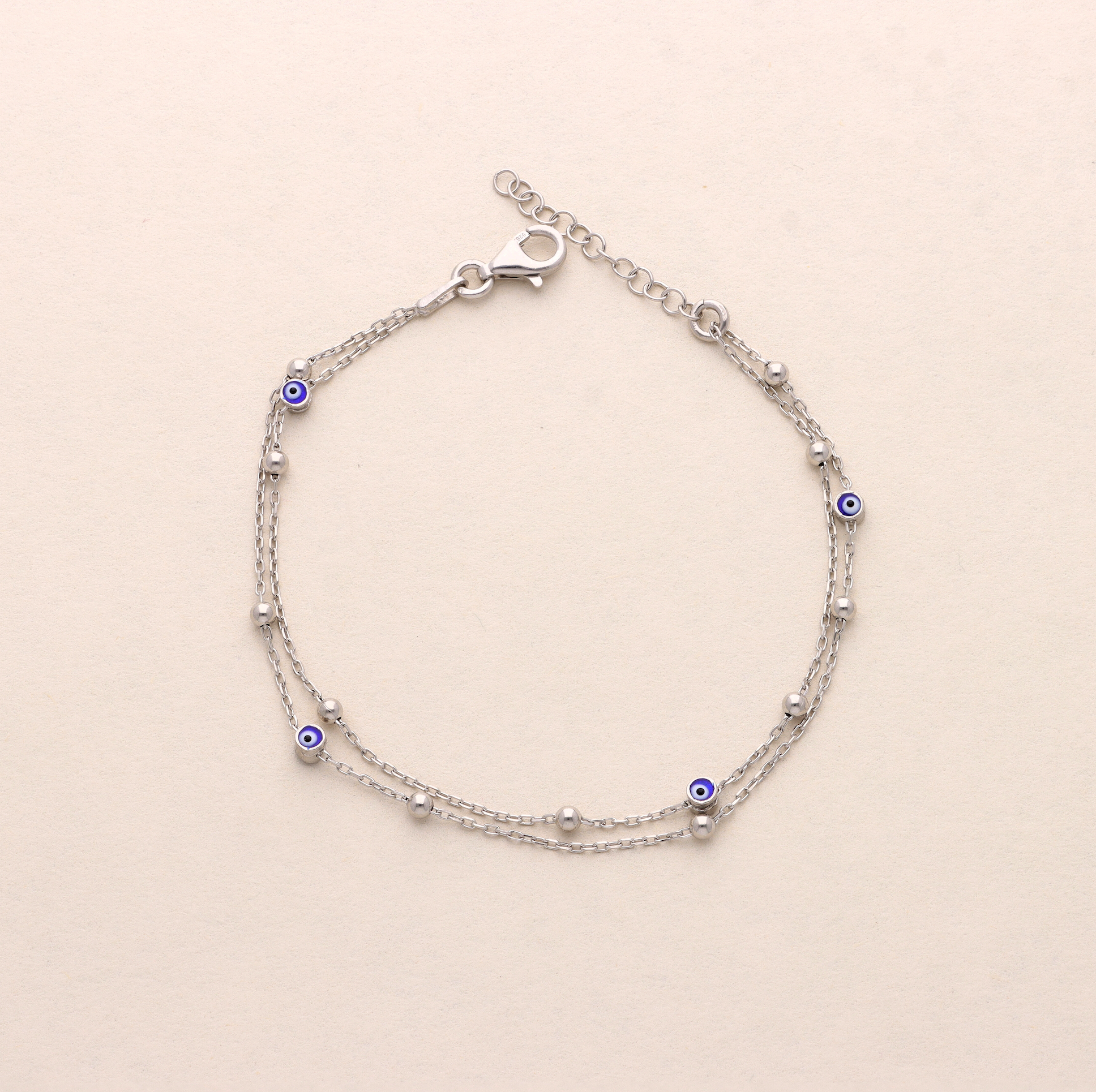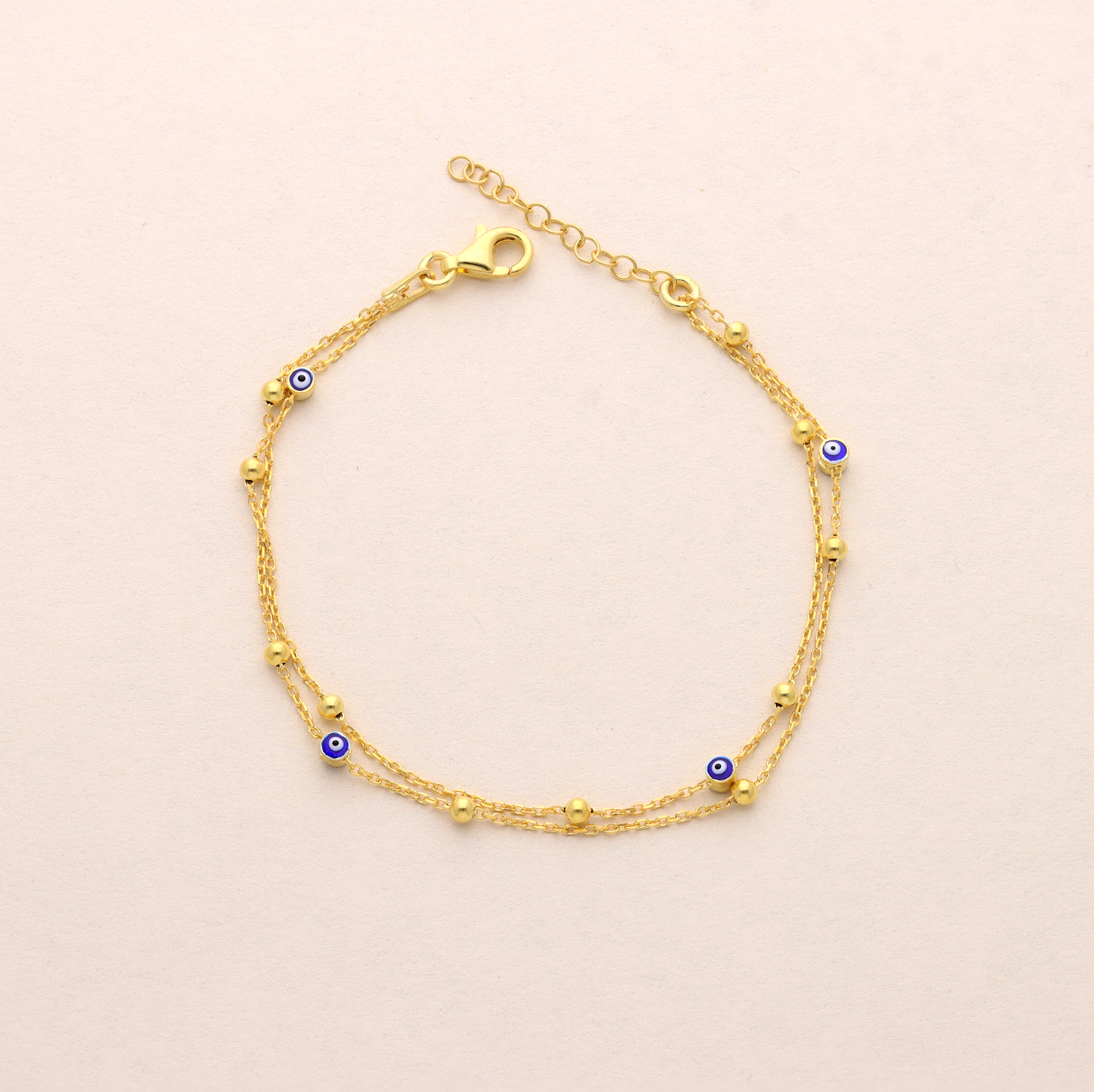 Discover the allure of our dainty two-layer bracelet, a delicate showcase of your minimalistic style. Featuring a series of tiny, captivating evil eyes along a fine link chain, this piece is further adorned with multiple petite beads. Effortlessly elegant, this bracelet is perfect for adding a touch of charm to any outfit.