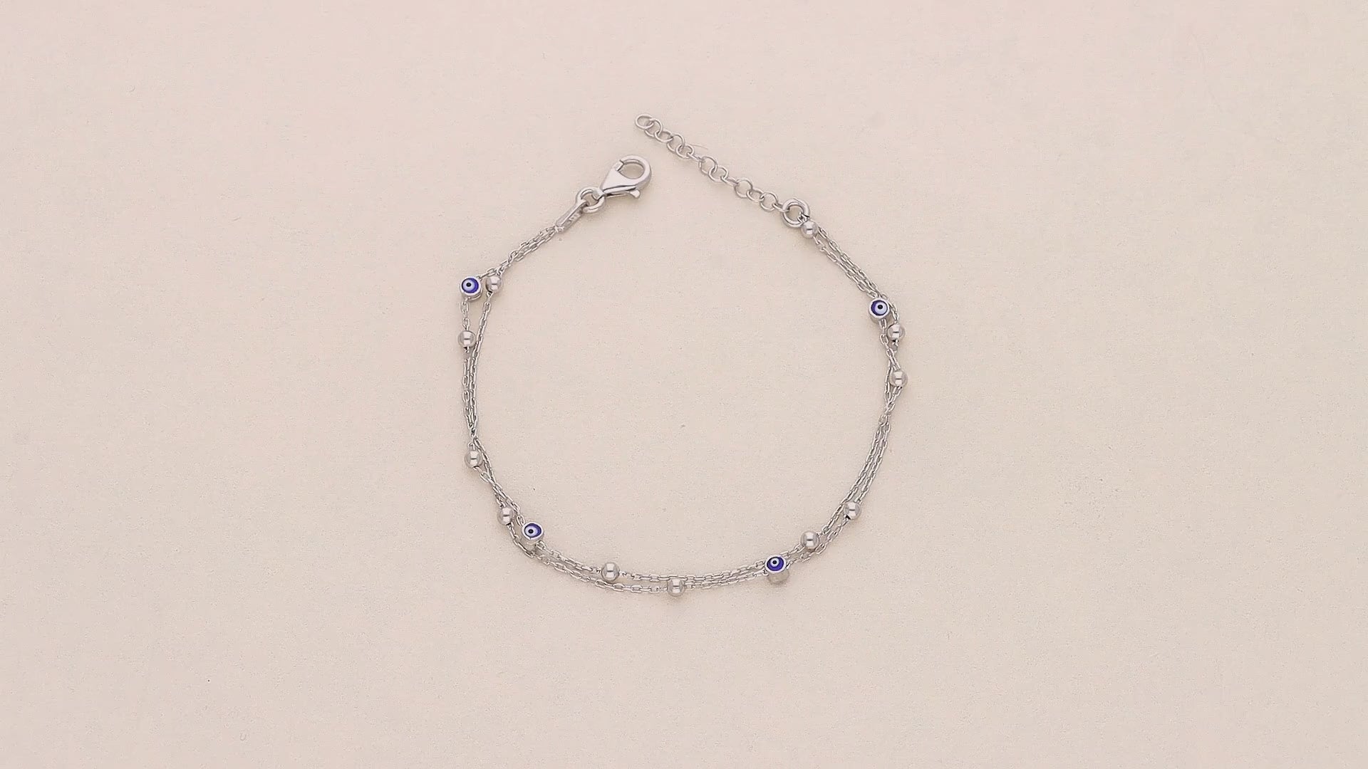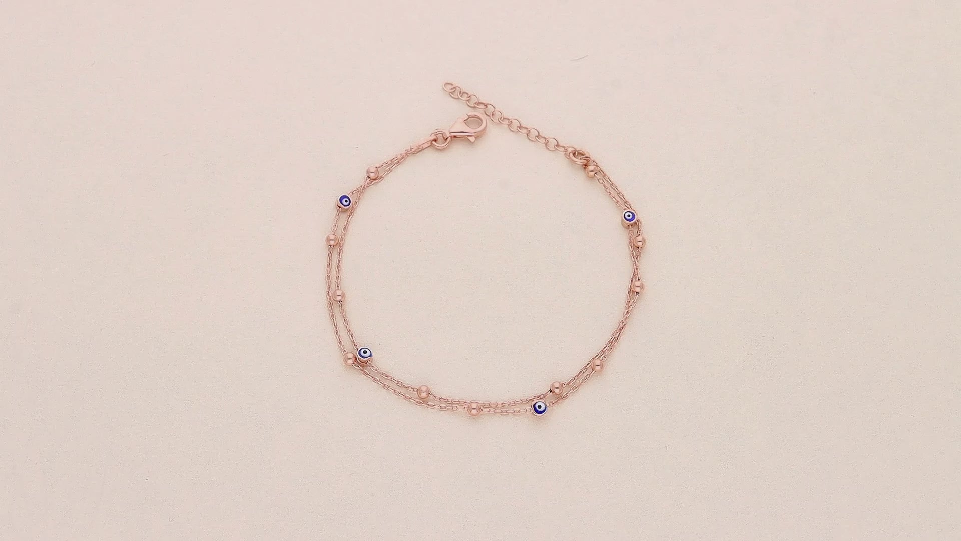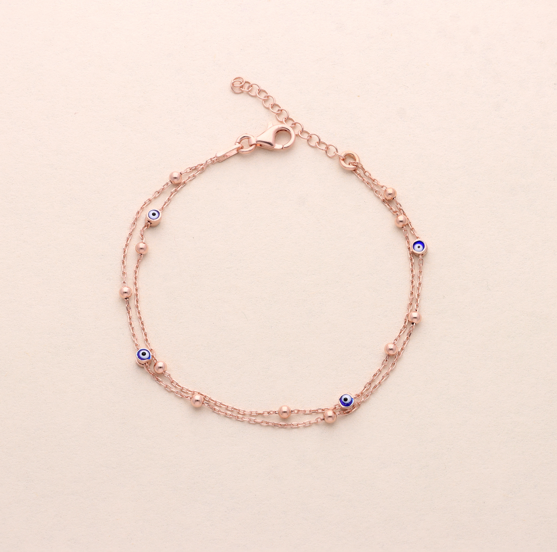 Discover the allure of our dainty two-layer bracelet, a delicate showcase of your minimalistic style. Featuring a series of tiny, captivating evil eyes along a fine link chain, this piece is further adorned with multiple petite beads. Effortlessly elegant, this bracelet is perfect for adding a touch of charm to any outfit.