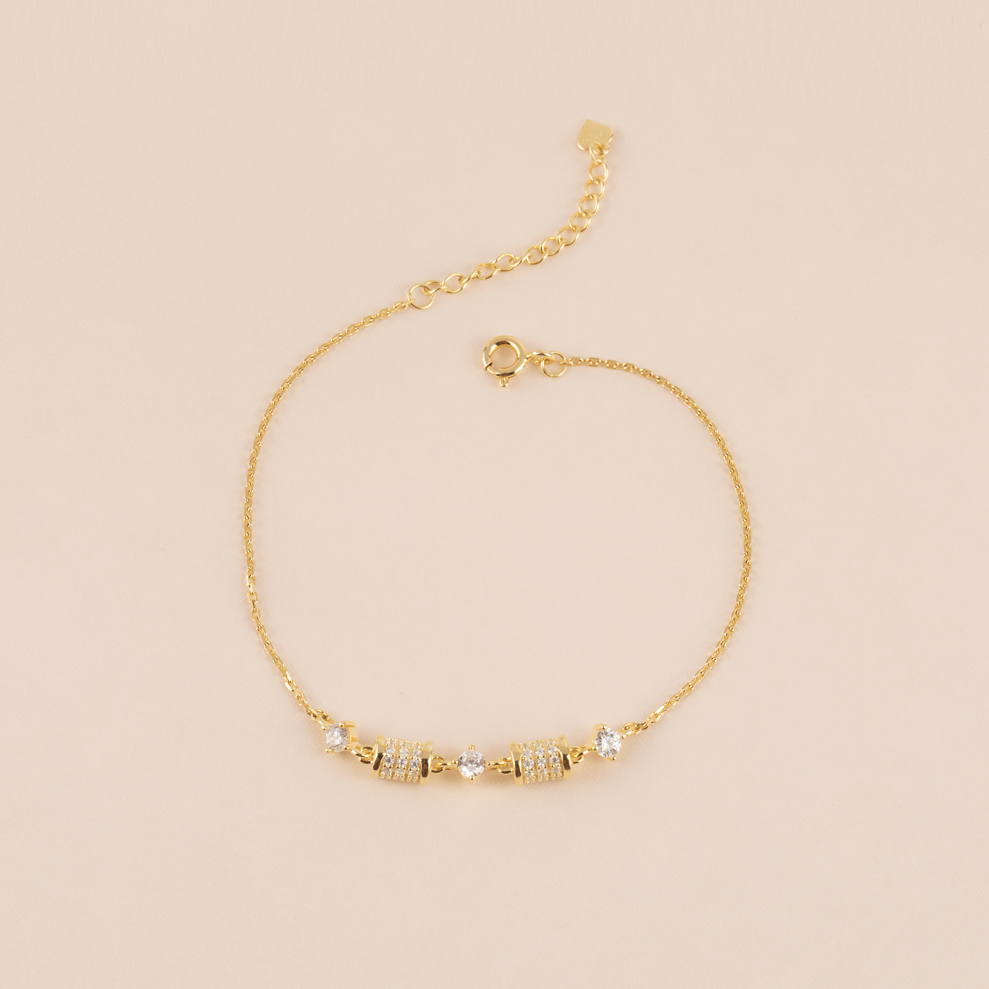 The Navette Bracelet is a timeless piece crafted in a gold finish, featuring dazzling cubic zirconia stones and intricately designed barrel-shaped accents. Set on a delicate chain, this bracelet combines simplicity with sophistication, making it perfect for adding a touch of sparkle to any look. Adjustable for a comfortable fit, it's a versatile addition to your jewellery collection, ideal for both everyday wear and special occasions.