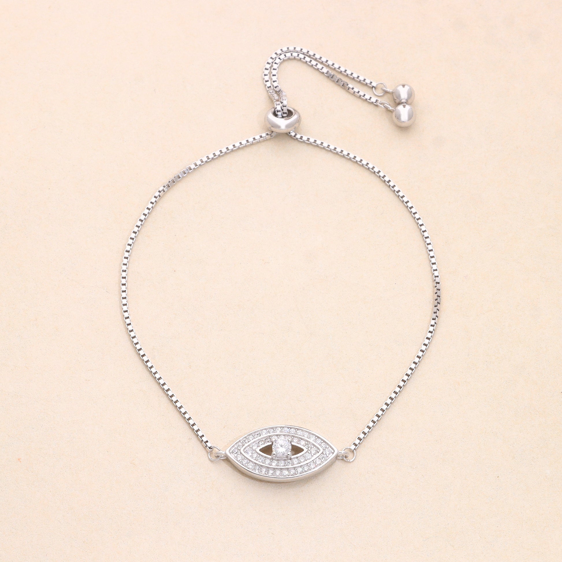 A striking pavé crystal evil eye charm takes centre stage on a sleek silver box chain, its intricate layers of sparkling stones framing a bold round crystal at the pupil. Rooted in ancient symbolism and reimagined in a modern, minimalist silhouette, it's as meaningful as it is beautiful. The adjustable sliding closure ensures a perfect fit for every wrist. Wear it as your everyday talisman — protection never looked this elegant.