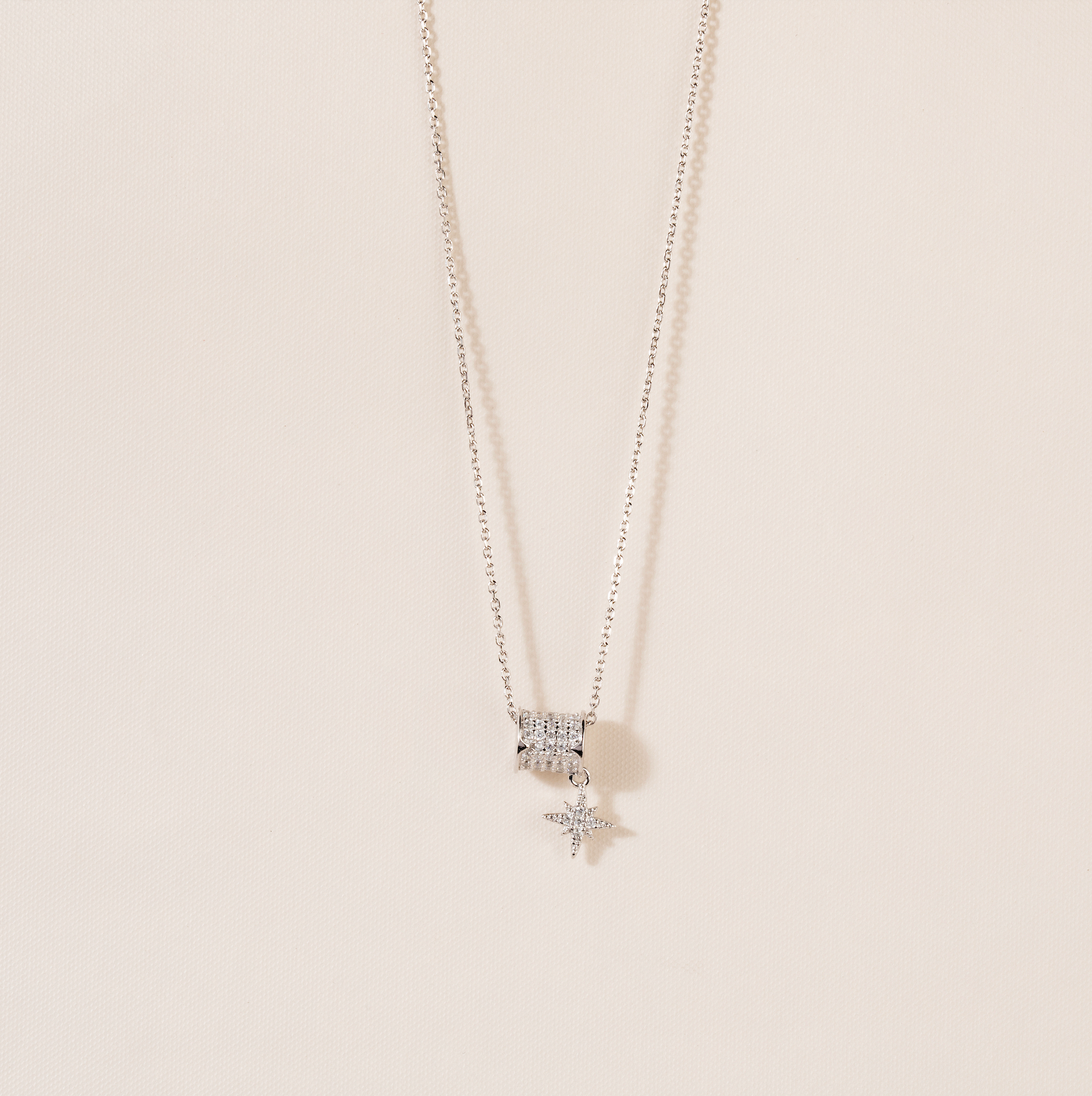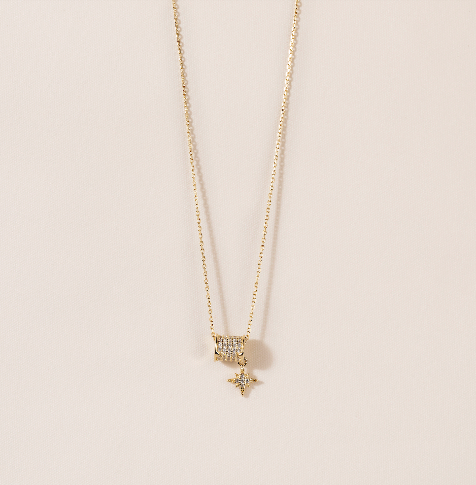 Add a touch of elegance with our stunning necklace, featuring a delicate chain and a unique pendant design. The necklace features a shimmering, cubic zirconia-studded barrel, complemented by a dainty, dangling star that adds a graceful touch. Available in both gold and silver finishes, this versatile piece brings a hint of sparkle and sophistication to any look, perfect for layering or wearing solo as a standout accessory.