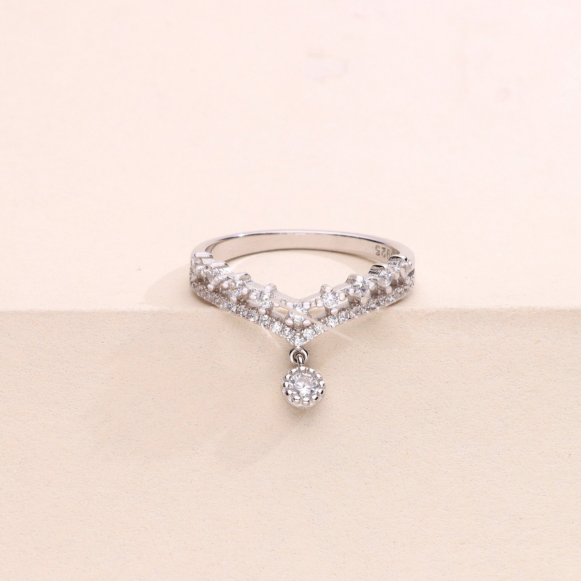 This elegant ring draws inspiration from the classic form of a tiara, crowned with a central peak and a single gemstone suspended delicately from its apex. The base features two rows of diamonds: one with larger, spaced stones for a bold effect, and the other with a tightly set line of smaller diamonds, creating a harmonious sparkle. Refined and graceful, this ring is a statement of sophistication and timeless charm.
