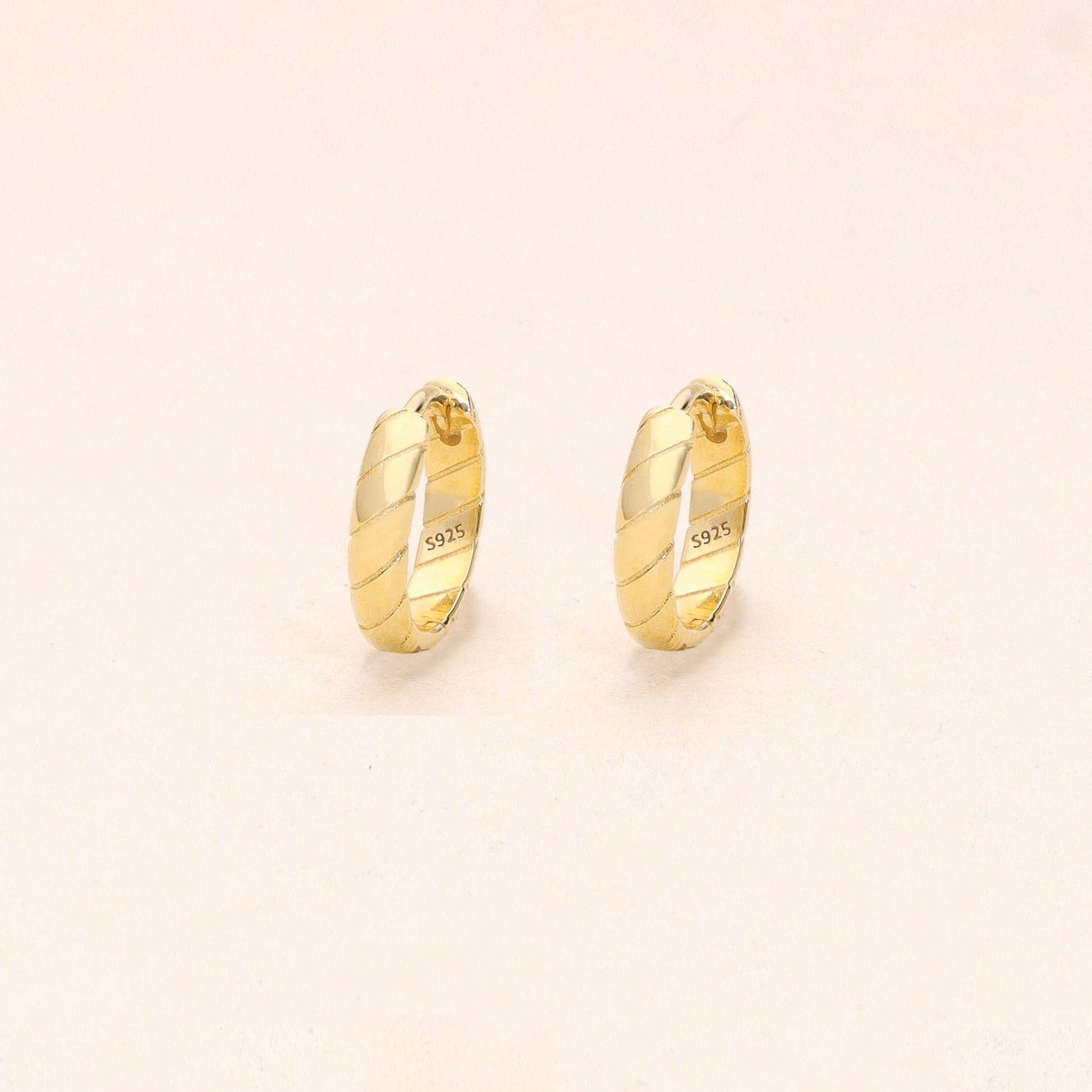 Crafted in 925 sterling silver with a rich gold finish, these chunky huggie hoops feature a diagonal quilted texture etched across their wide, domed surface. The geometric pattern creates a subtle interplay of light and shadow, giving them a luxe, fashion-forward feel. Small in size but big in impact — they hug the ear perfectly and add instant warmth and texture to any look.